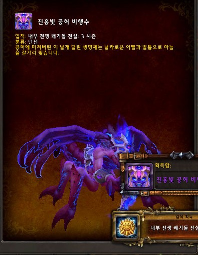 위 업적을 완료하면 진홍빛 공허 비행수 탈것이 지급된다.