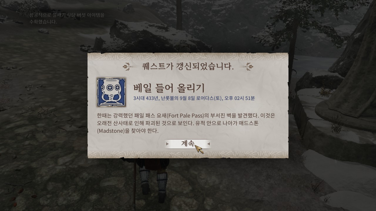 리버우드에서 관련 주요 임무를 시작하지 않았음에도 마치 진행 중인 것처럼 야를 발그루프와 대화할 수 있다.